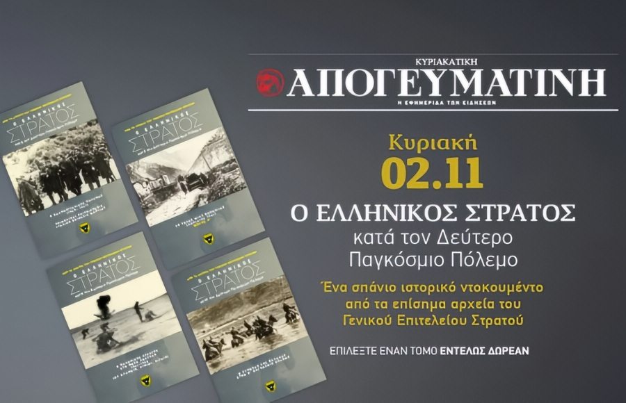 Μη χάσετε στις 2 Νοεμβρίου αποκλειστικά με την Kυριακάτικη Απογευματινή, εντελώς δωρεάν, ένα σπάνιο ιστορικό ντοκουμέντο «Ο Ελληνικός Στρατός κατά τον δεύτερο Παγκόσμιο Πόλεμο», από τα επίσημα αρχεία του Γενικού Επιτελείου Στρατού, για να επιλέξετε.