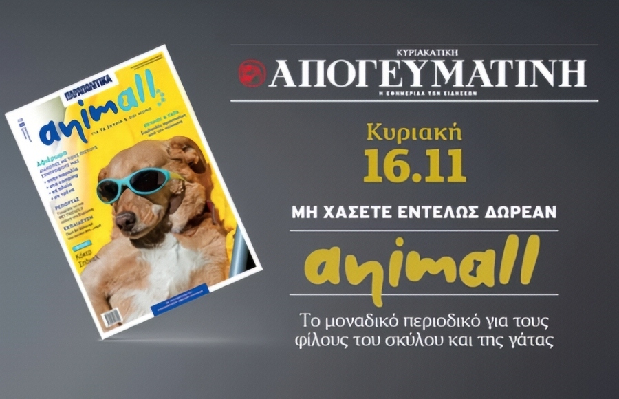 Aυτή την Κυριακή, 16 Νοεμβρίου, κυκλοφορεί το «ANIMALL», το μοναδικό περιοδικό για τους φίλους του σκύλου και της γάτας, εντελώς δωρεάν, σε πολυτελή έκδοση με την κυριακάτικη Απογευματινή.