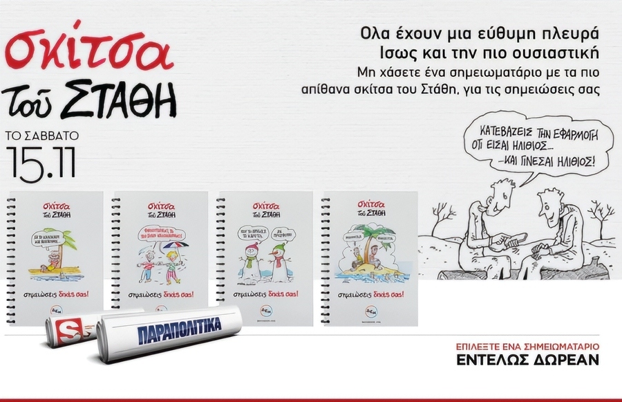 Μη χάσετε ένα Σημειωματάριο με τα πιο απίθανα σκίτσα του Στάθη, για τις σημειώσεις σας, εντελώς δωρεάν, αυτό το Σάββατο 15.11 αποκλειστικά με τα Παραπολιτικά.