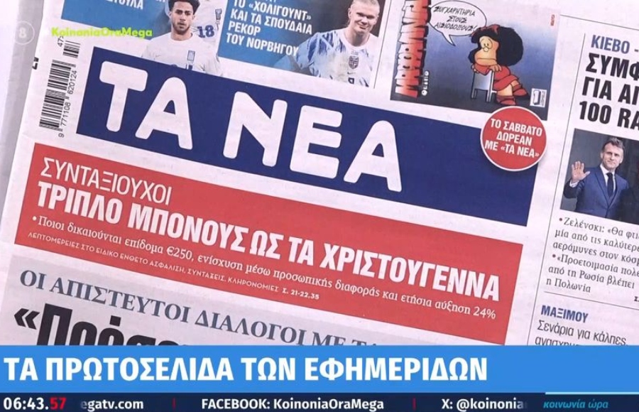 Τα σημερινά πρωτοσέλιδα των εφημερίδων παρουσίασαν το πρωί της Τρίτης 18/11 στην εκπομπή «Κοινωνία Ώρα MEGA».