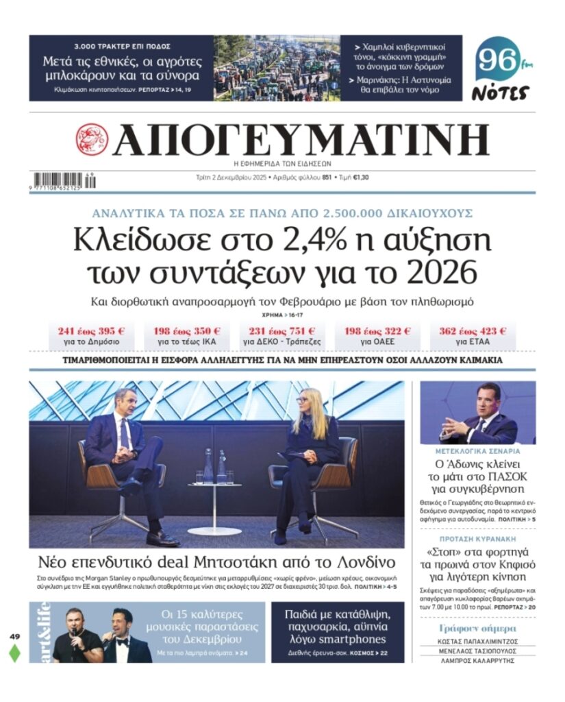 Κλείδωσε στο 2,4% η αύξηση των συντάξεων για το 2026