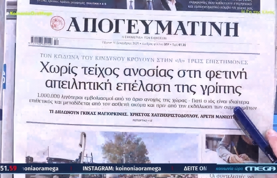 Τα σημερινά πρωτοσέλιδα των εφημερίδων παρουσίασαν το πρωί της Πέμπτης 11/12 στην εκπομπή «Κοινωνία Ώρα MEGA».
