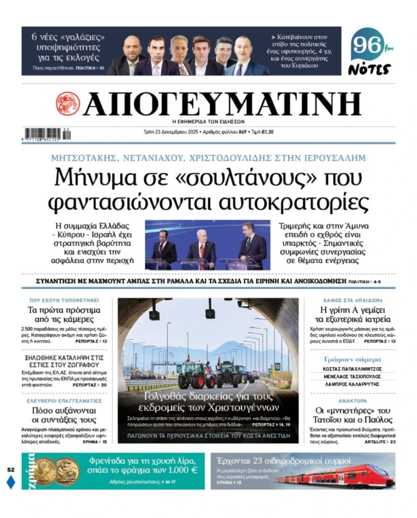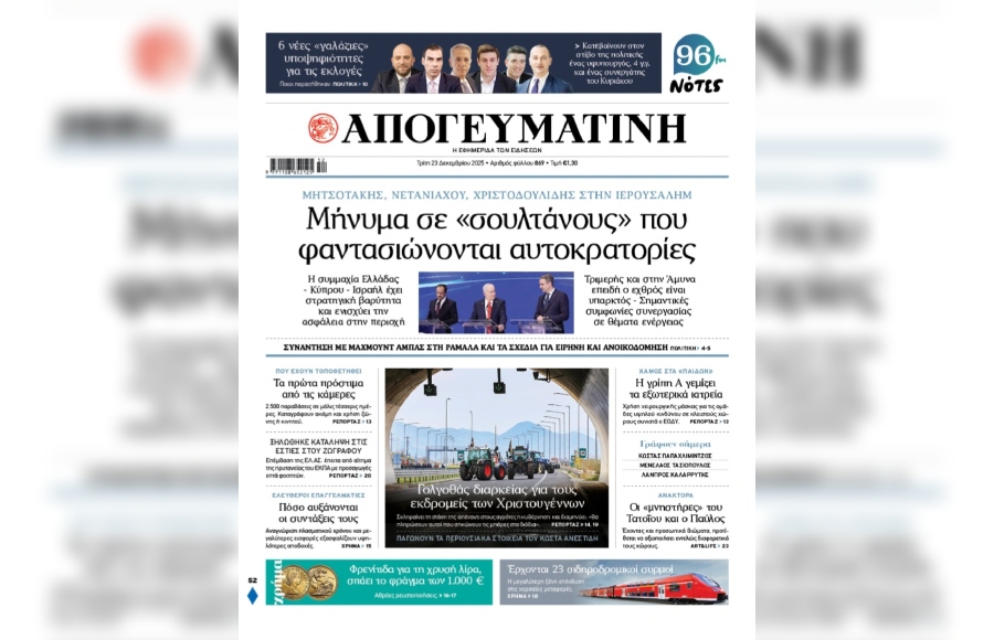 Διαβάστε στην Απογευματινή, σήμερα Τρίτη (23/12):