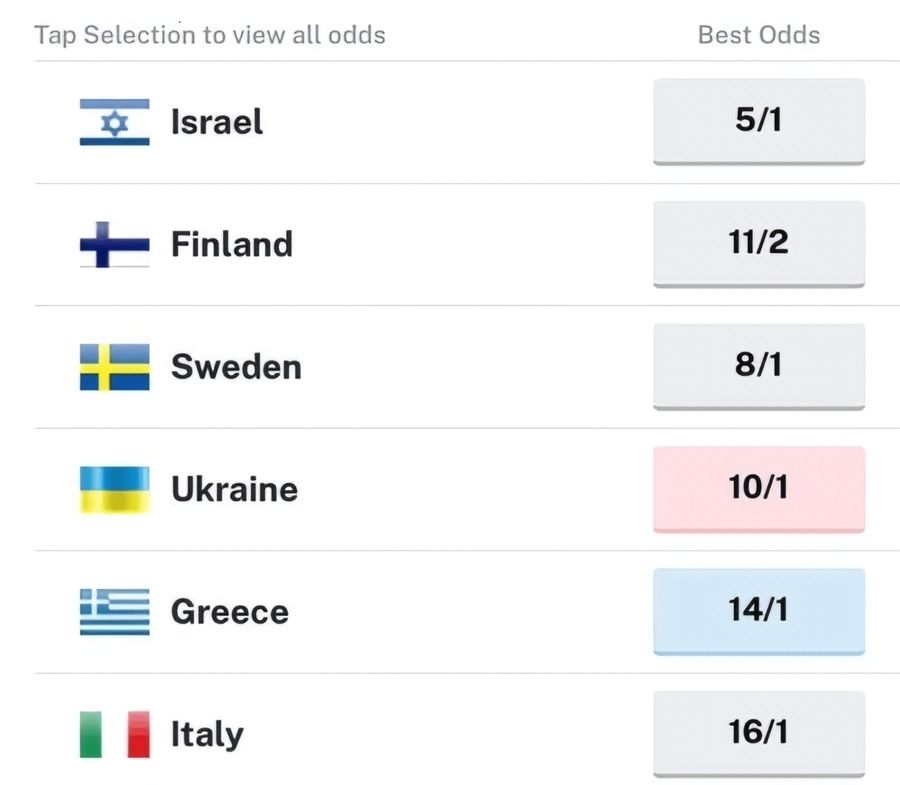 Σύμφωνα με τα δεδομένα που αποτυπώνονται αυτή τη στιγμή στις διεθνείς στοιχηματικές αγορές και το «Odds Checker», το Ισραήλ διατηρεί το προβάδισμα, με τη Φινλανδία και τη Σουηδία να ακολουθούν σε μικρή απόσταση. Την τέταρτη θέση καταλαμβάνει η Ουκρανία, ενώ η Ελλάδα βρίσκεται πλέον στην πέμπτη θέση, κλείνοντας την πρώτη πεντάδα των φαβορί για τη νίκη. Η συγκεκριμένη κατάταξη δείχνει ξεκάθαρα ότι η ελληνική συμμετοχή αντιμετωπίζεται πλέον με διαφορετικό μάτι από τις αγορές, ως μία πρόταση με πραγματικές πιθανότητες και όχι ως μια συμπληρωματική παρουσία.