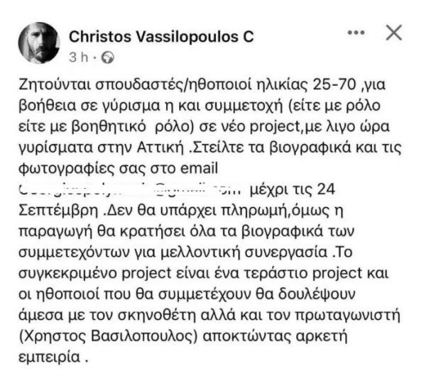 Έντονες αντιδράσεις έχει προκαλέσει μια ανάρτηση του Χρήστου Βασιλόπουλου, με την οποία ψάχνει ηθοποιούς για νέα παραγωγή.