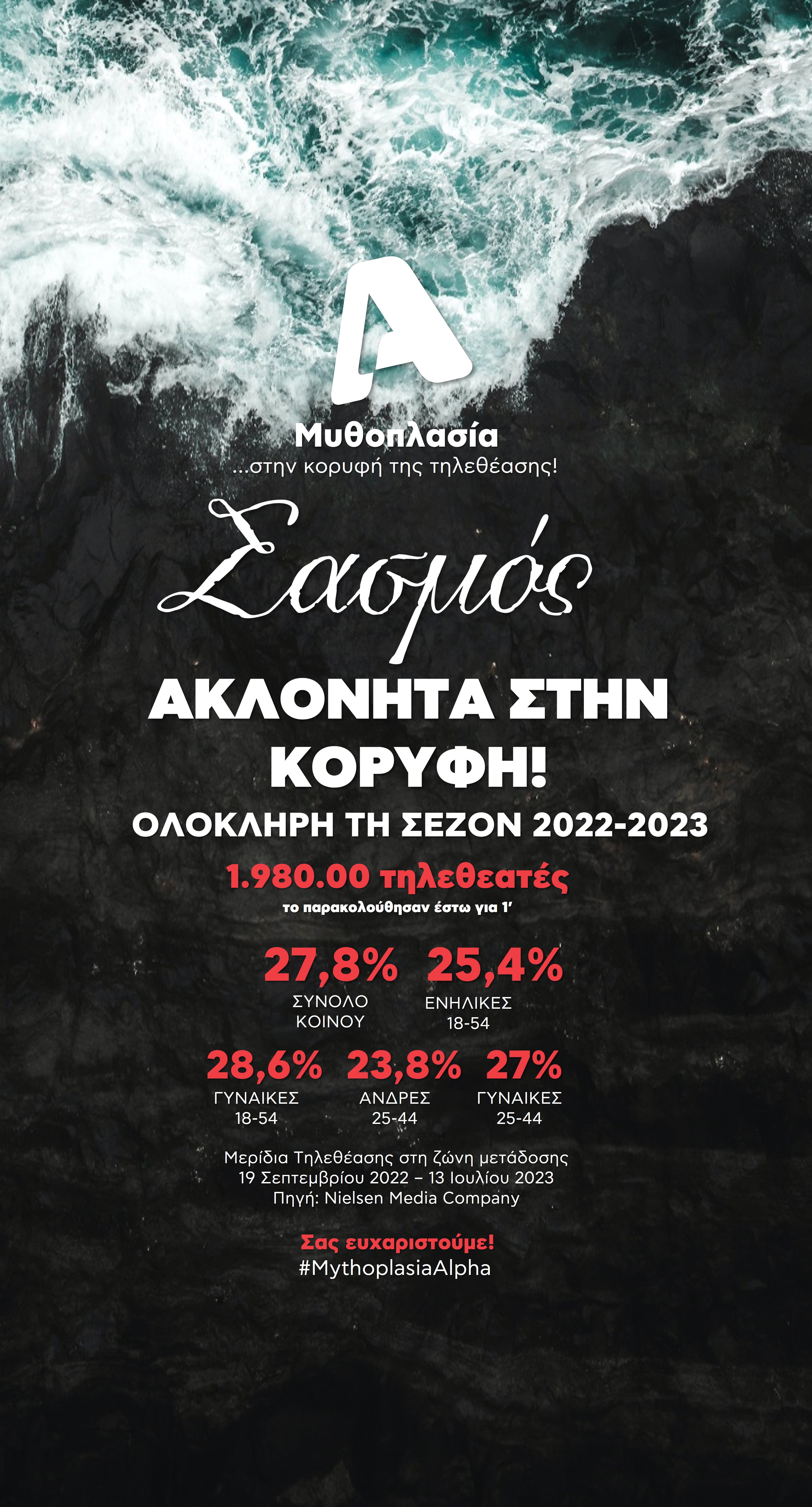 Με 27,8% στο σύνολο κοινού και 25,4% στο δυναμικό κοινό 18-54 ο Σασμός έκλεισε τη σεζόν κρατώντας την κορυφή. Πρωτιά για τη σεζόν είχε και σε επιμέρους γυναικεία κοινά, με ποσοστά 28,6% (Γ18-54) και 27% (Γ25-44), αλλά και σε αντρικό κοινό (Α25-44) με 23,8%.