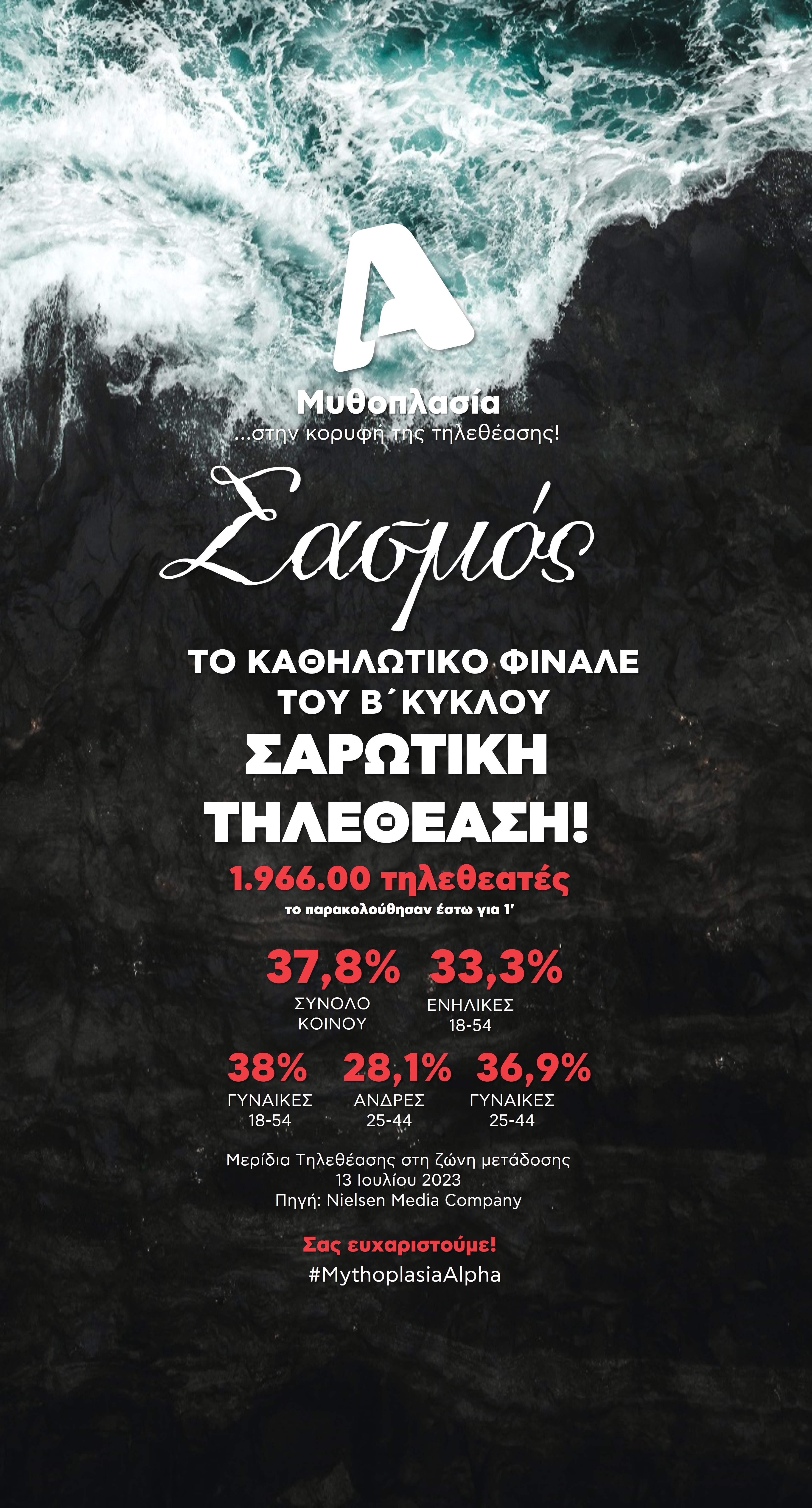 Ο Σασμός, η πιο όμορφη, η πιο δυνατή και η πιο σύνθετη ιστορία αγάπης, που έχει καθηλώσει εκατομμύρια τηλεθεατές μπροστά την οθόνη του Alpha, έκλεισε τον δεύτερο κύκλο, χθες, Πέμπτη 13 Ιουλίου, με ένα συγκλονιστικό επεισόδιο, που καθήλωσε 1.217.000 τηλεθεατές!